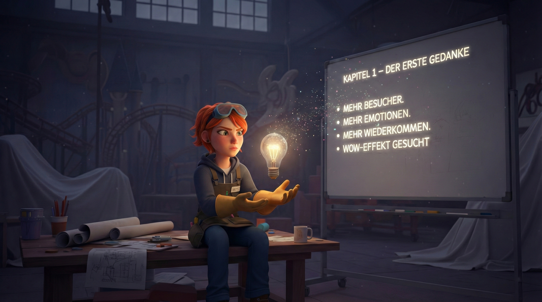 Jedes große Abenteuer beginnt mit einem kleinen Funken. Begleite uns auf der Reise von der ersten Skizze bis zur gigantischen Erlebniswelt. Wir zeigen dir, wie aus Träumen echte Orte werden. WO FANTASIE ZUR REALITÄT WIRD Start der reise WO FANTASIE ZUR REALITÄT WIRD Referenzen Jeder Freizeitpark hat den Wunsch zu wachsen – sei es durch mehr Besucher, tiefere Emotionen oder den Grund, immer wiederzukommen. Vielleicht steht eine neue Saison an, ein neues Themenareal wird geplant oder es fehlt einfach noch der entscheidende Wow-Effekt. Genau an diesem Punkt beginnt unsere gemeinsame Reise. Kapitel 1 – Der erste Gedanke Skip To End skip_next 01/ 07 zum nächsten kapitel zu den Referenzen zurück Bevor wir den ersten Strich zeichnen, hören wir erst einmal zu. Wir analysieren gemeinsam: Was ist das Ziel? Wer ist die Zielgruppe und welche Fläche steht uns zur Verfügung – Indoor oder Outdoor? Wir denken dabei nicht in einfacher Dekoration, sondern erschaffen von Anfang an ganzheitliche Erlebniswelten. Kapitel 2 – Zuhören, Verstehen, Vision entwickeln Skip To End skip_next 02/ 15 zum nächsten kapitel zurück zu den Referenzen Jetzt wird aus der ersten Idee eine greifbare Struktur. Wir entwickeln fesselnde Storylines, passgenaue Farbkonzepte und eine durchdachte Besucherführung. Dank fotorealistischer 3D-Simulationen zeigen wir dir exakt, wie das fertige Erlebnis aussehen wird – noch lange bevor es in die Produktion geht. Kapitel 3 – Konzept & Simulation Skip To End skip_next 03/ 07 zum nächsten kapitel zurück zu den referenzen In unseren Produktionsstätten entstehen aus digitalen Plänen reale Welten. Mit großer Leidenschaft modellieren, schleifen und lackieren wir jedes Detail von Hand.